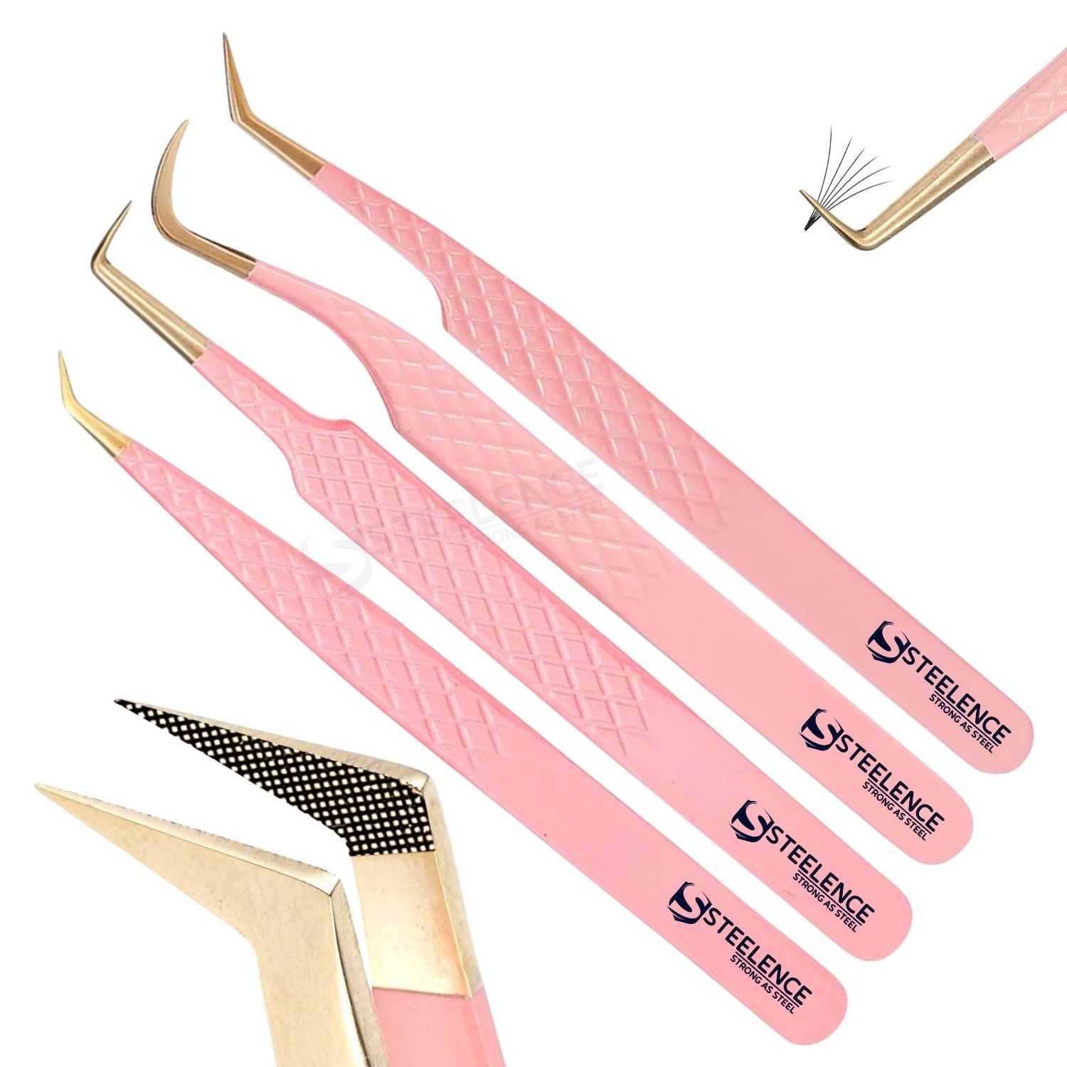 This premium eyelash tweezers set is crafted for professional lash artists who demand accuracy, durability, and comfort during detailed lash work. Designed in an elegant pink finish with gold plasma points, each tool combines visual appeal with reliable performance for daily salon use.