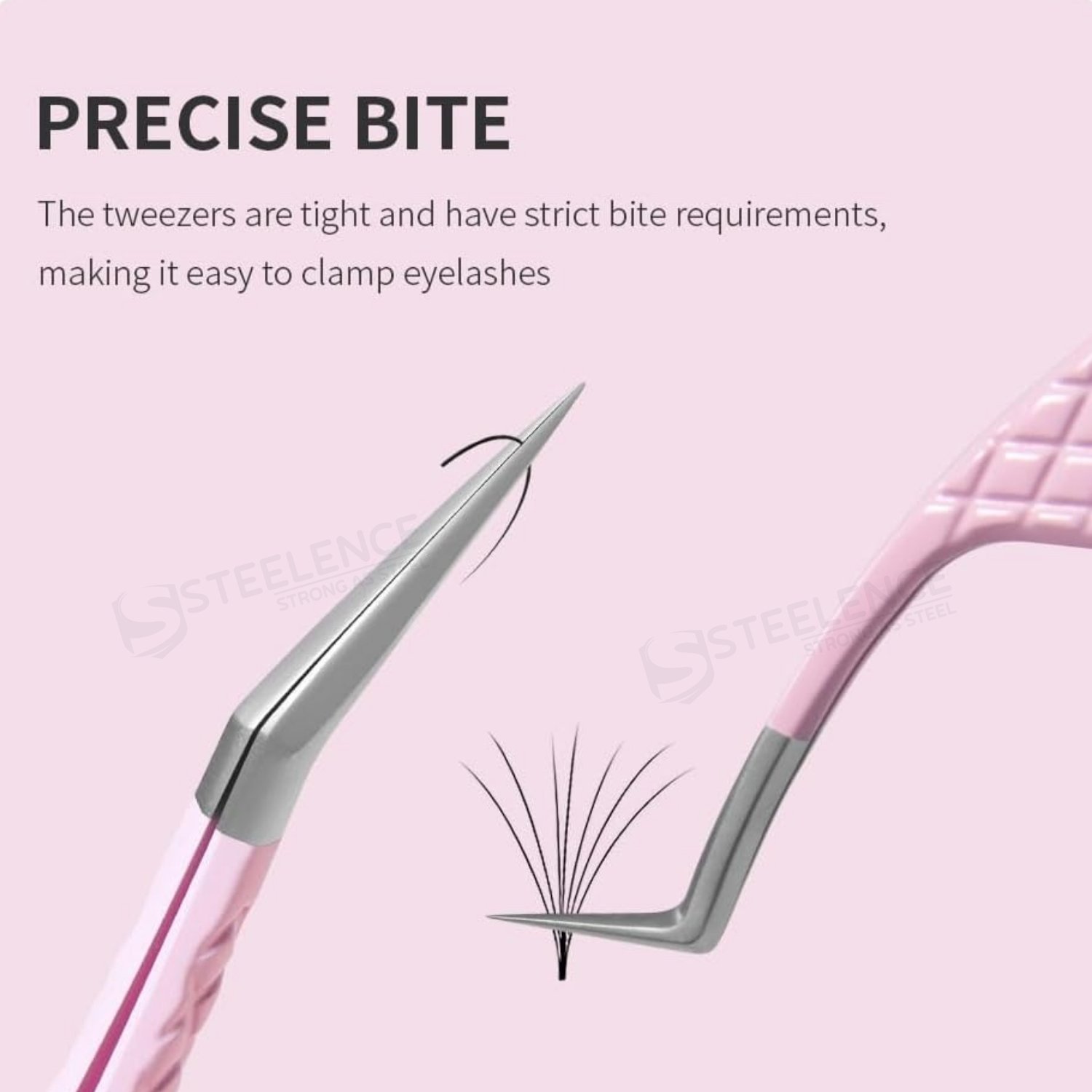 • Steelence L-type boot volume tweezers designed for pro lash fan creation and precision grip, ideal for lash artists and global buyers.
