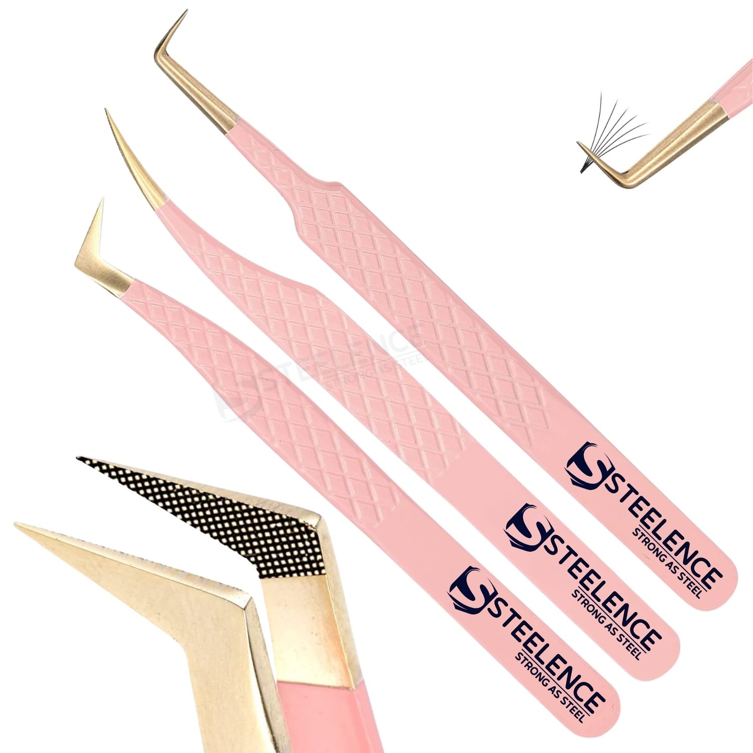 The set includes 45 degree angled tweezers, straight tweezers, and L type volume tweezers, allowing lash artists to perform isolation, classic application, and volume fan creation with confidence. Each tool features a high-quality fiber tip, finished with a gold point, ensuring excellent grip, reduced lash slippage, and consistent pickup during application.