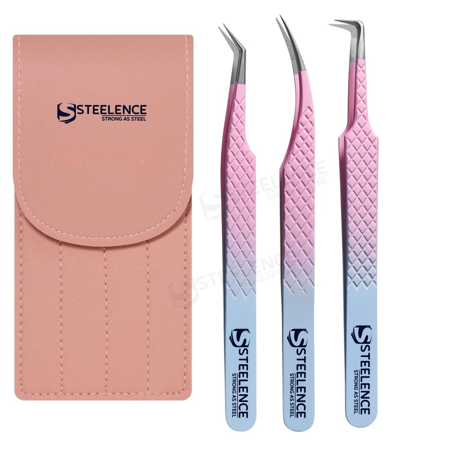 The set includes three essential tweezers types used by lash professionals worldwide.