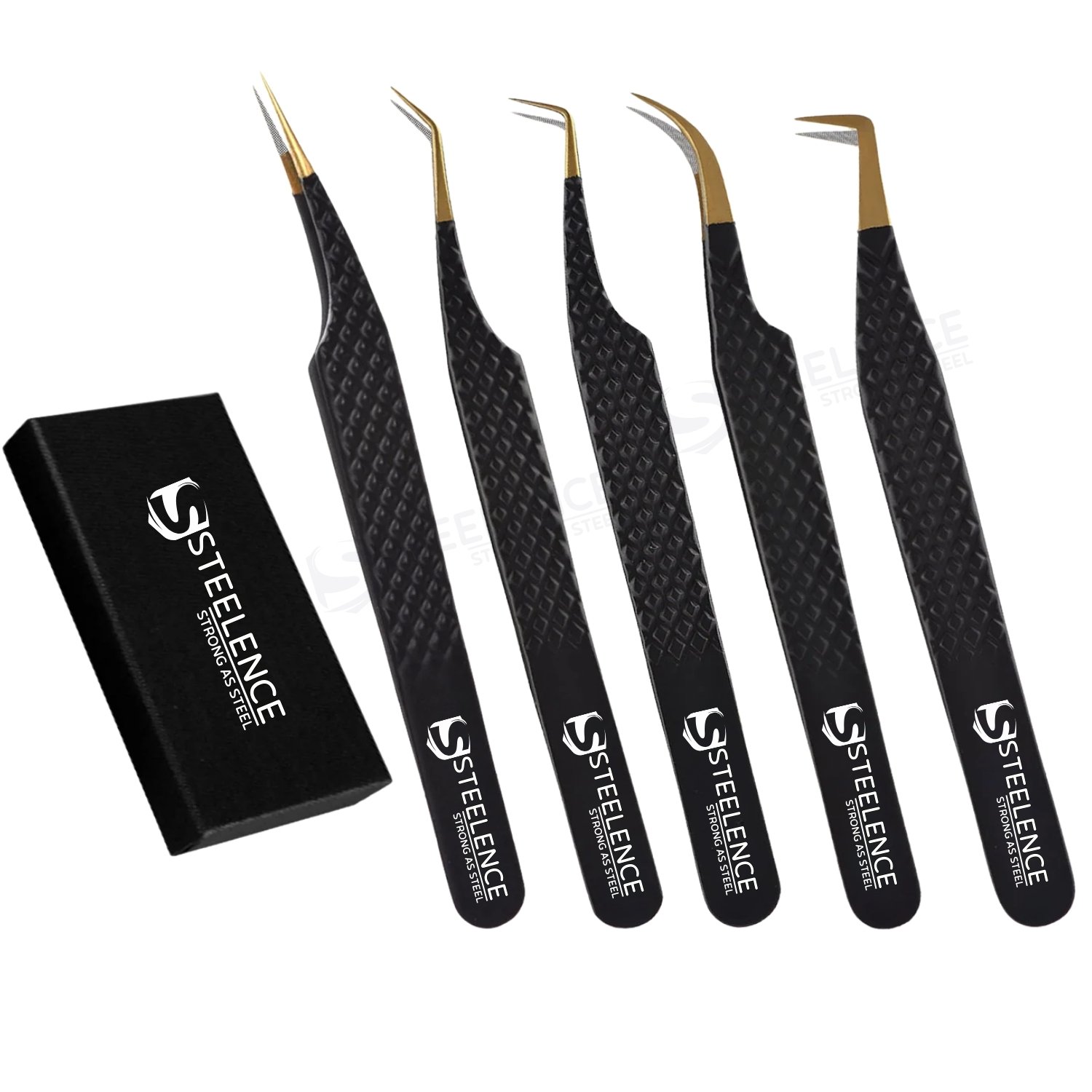 Each tweezer features a black powder coated handle that provides a non-slip, ergonomic grip, reducing hand fatigue during long lash application sessions. The gold-plated precision tips with fiber grip technology ensure strong lash pickup, improved fan control, and accurate placement without slipping. This makes them ideal for classic, volume, and Russian volume lash techniques.